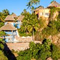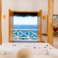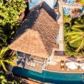The villa features tropical-style décor, with thatched-roof terraces and a spacious open-air dining area for 10 guests. There is also a large indoor seating area and a fitness centre. The three-bedroom suites all have ocean views, a private bathroom, TV and wardrobe. There is also a fully equipped kitchen and guests can hire a full-time cook for an extra fee.