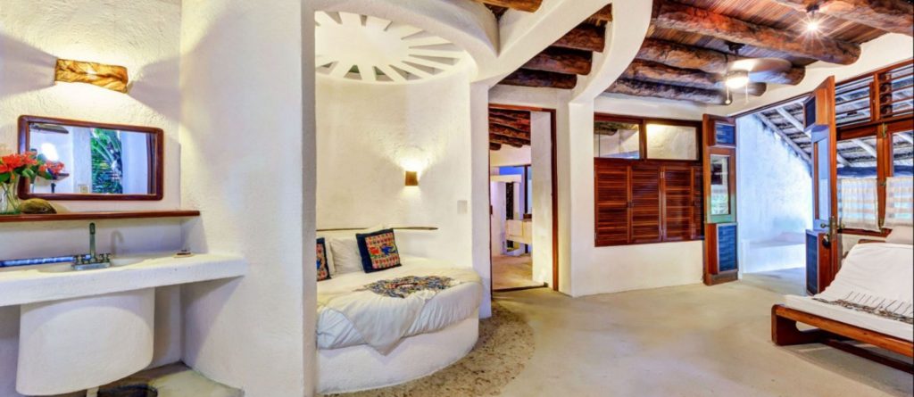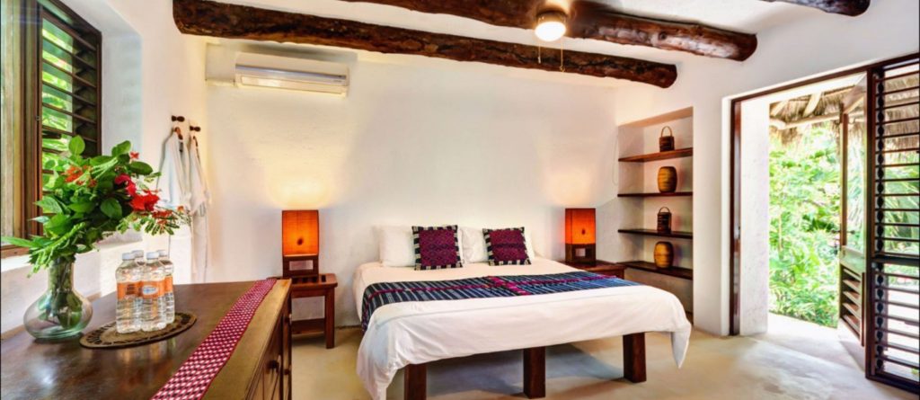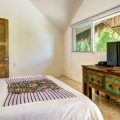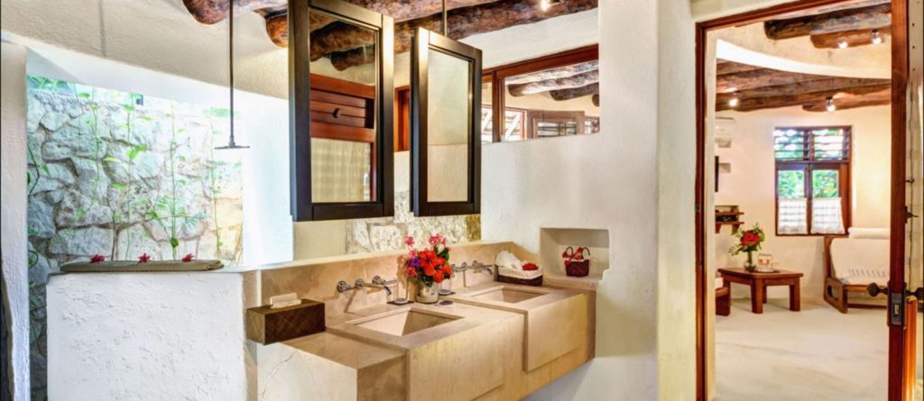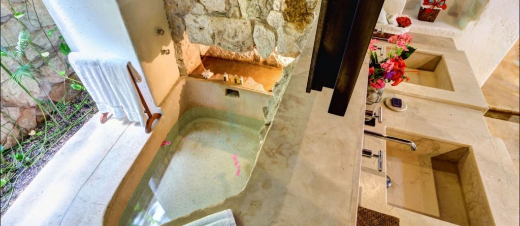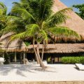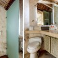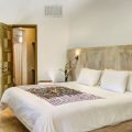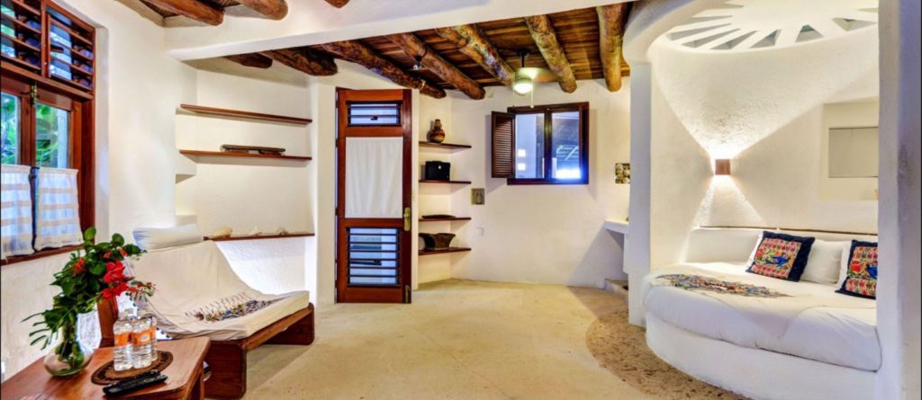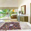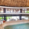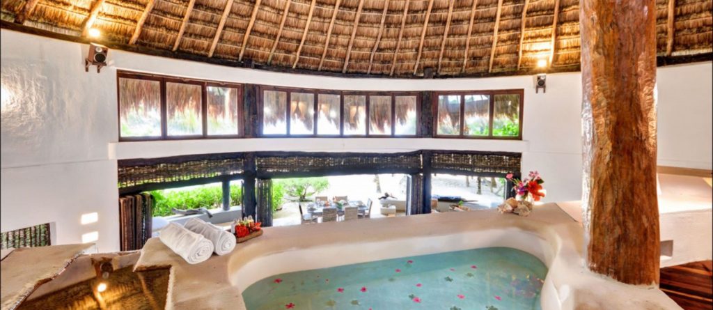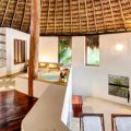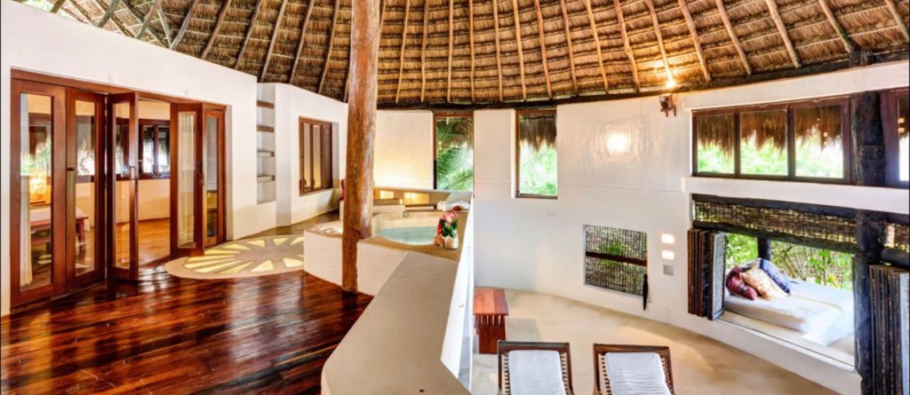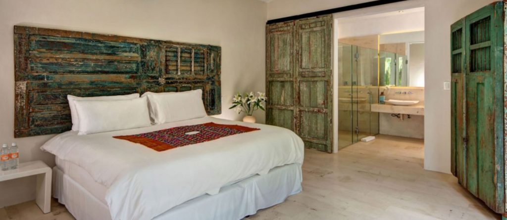 The villa’s design strikes a delicate balance between elegance and a relaxed vibe. Rustic elements like exposed rough-hewn beams, thatched roofs, and wicker contrast with crisp white walls and smooth stone surfaces. The minimalist furnishings and floor-to-ceiling folding doors create an uncomplicated style, leading to an outside terrace where gentle breezes flow through open spaces. The main living area, under a soaring palapa, features cool teak seating with a hint of mid-century modern. Colourful local tapestries add vibrant touches to the villa’s clean white walls. Each of the nine bedrooms boasts king-sized beds with soft linens, air conditioning, and tall windows. Most have spacious ensuite bathrooms, with some offering Jacuzzi tubs and jungle-like outdoor showers. For added privacy, one garden-view room has a private entrance. Unique features like a round bed in a cosy nook and repurposed antique architectural elements add to the villa’s charm.