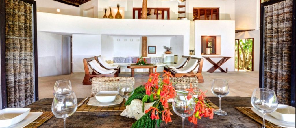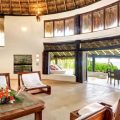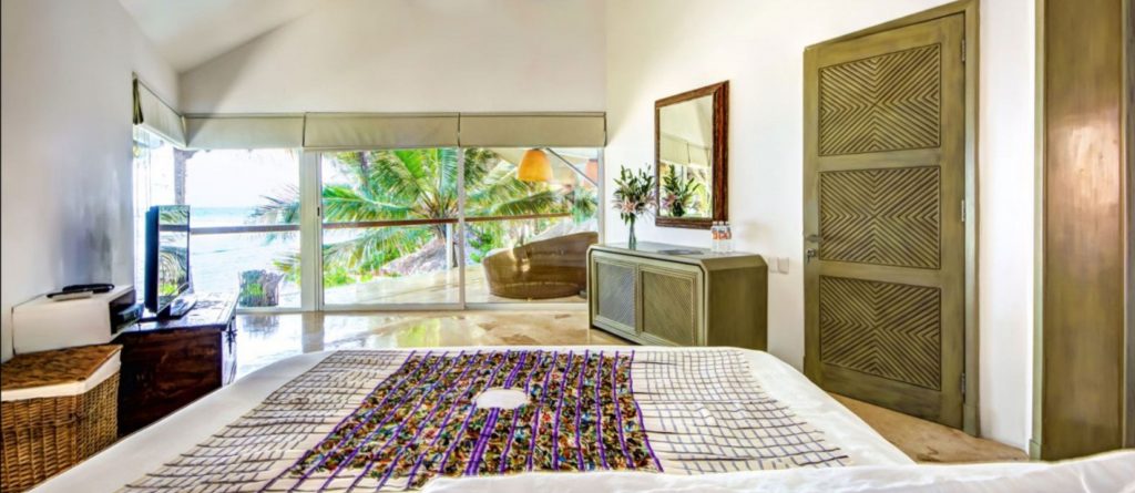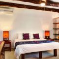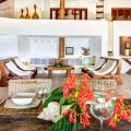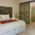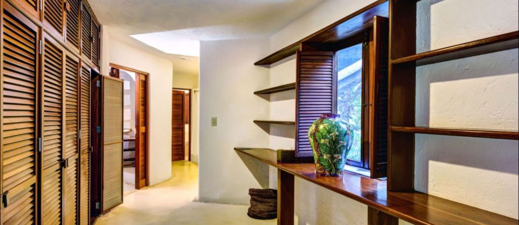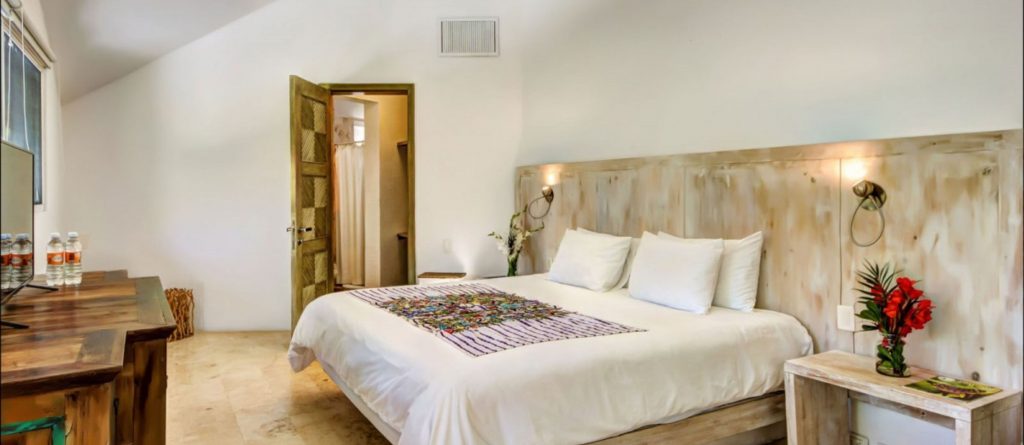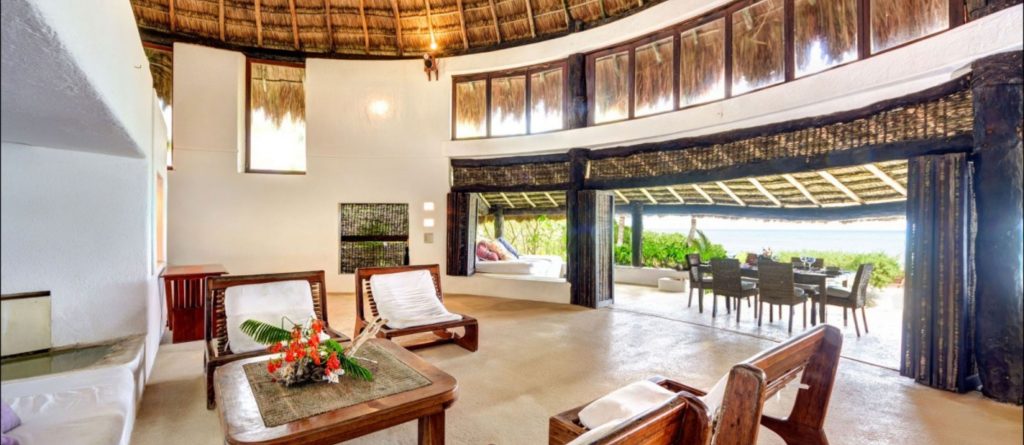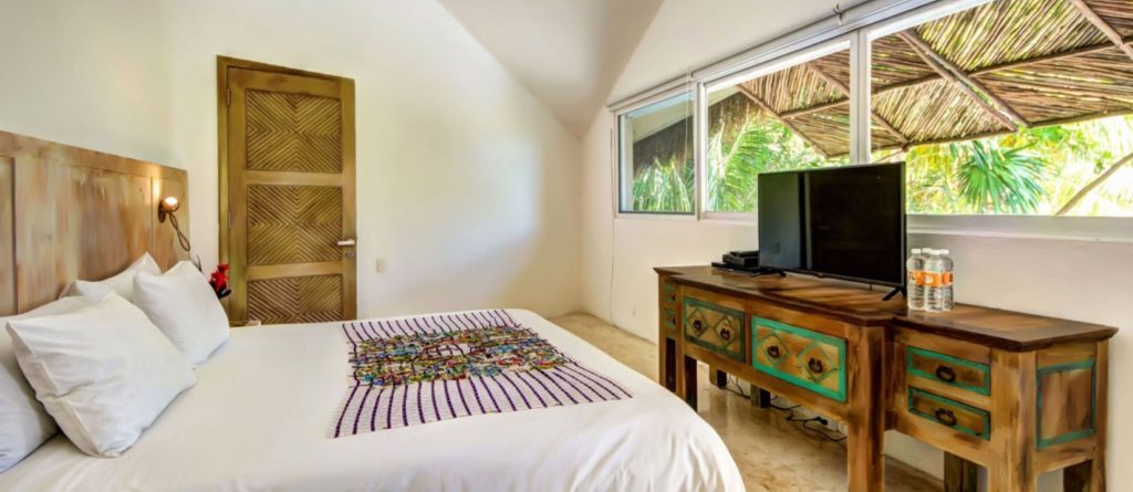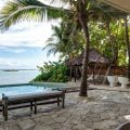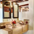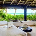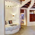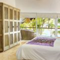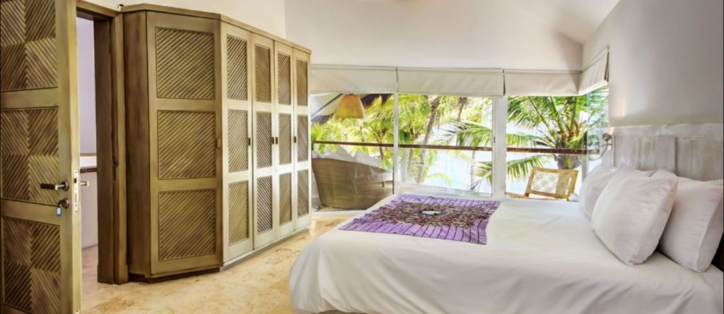 The villa’s design strikes a delicate balance between elegance and a relaxed vibe. Rustic elements like exposed rough-hewn beams, thatched roofs, and wicker contrast with crisp white walls and smooth stone surfaces. The minimalist furnishings and floor-to-ceiling folding doors create an uncomplicated style, leading to an outside terrace where gentle breezes flow through open spaces. The main living area, under a soaring palapa, features cool teak seating with a hint of mid-century modern. Colourful local tapestries add vibrant touches to the villa’s clean white walls. Each of the nine bedrooms boasts king-sized beds with soft linens, air conditioning, and tall windows. Most have spacious ensuite bathrooms, with some offering Jacuzzi tubs and jungle-like outdoor showers. For added privacy, one garden-view room has a private entrance. Unique features like a round bed in a cosy nook and repurposed antique architectural elements add to the villa’s charm.