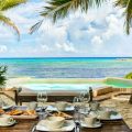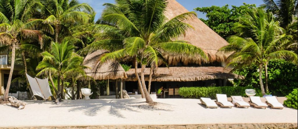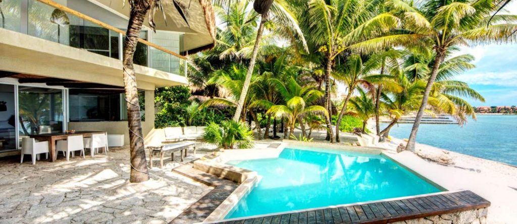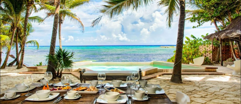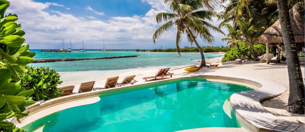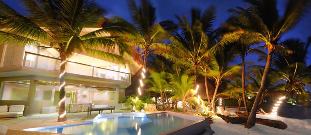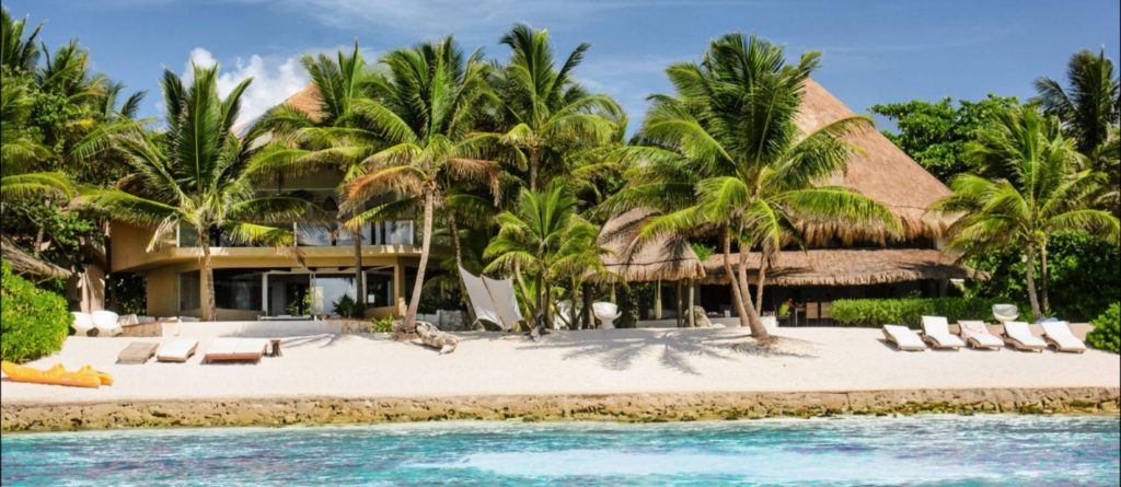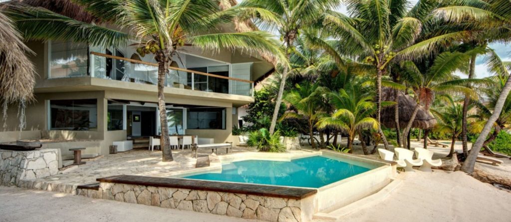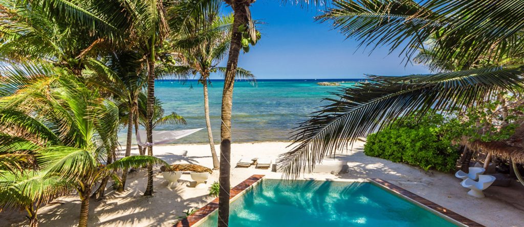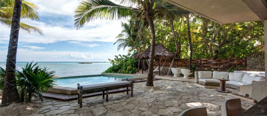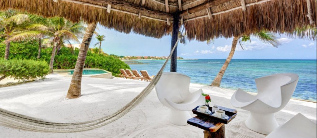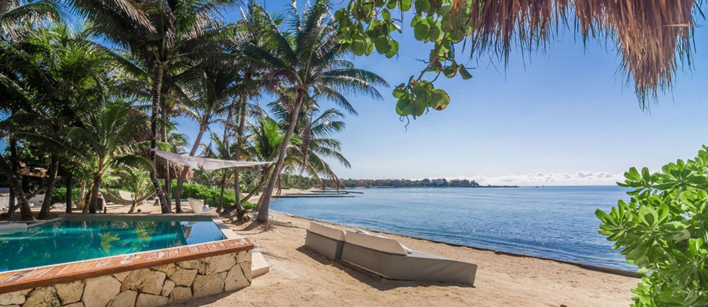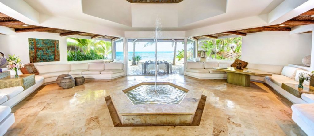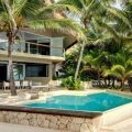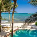 If you’re looking for a place to unwind, the stunning beachfront Villa Playa is the perfect choice. Just a 45-minute drive from Cancun, this luxury villa is nestled in the upscale residential community of Puerto Aventuras on the Riviera Maya. Puerto Estate offers easy access to ancient archaeological sites and breathtaking national parks, while the sounds of tropical birds and rolling waves greet you each morning. Though the community is quiet and secluded, a five-minute stroll brings you to a world-class marina with magnificent yachts. Tucked among towering palm trees, Villa Playa combines two separate villas to accommodate large groups. With nine bedrooms, it comfortably sleeps up to 18 guests, making it ideal for family and friends.